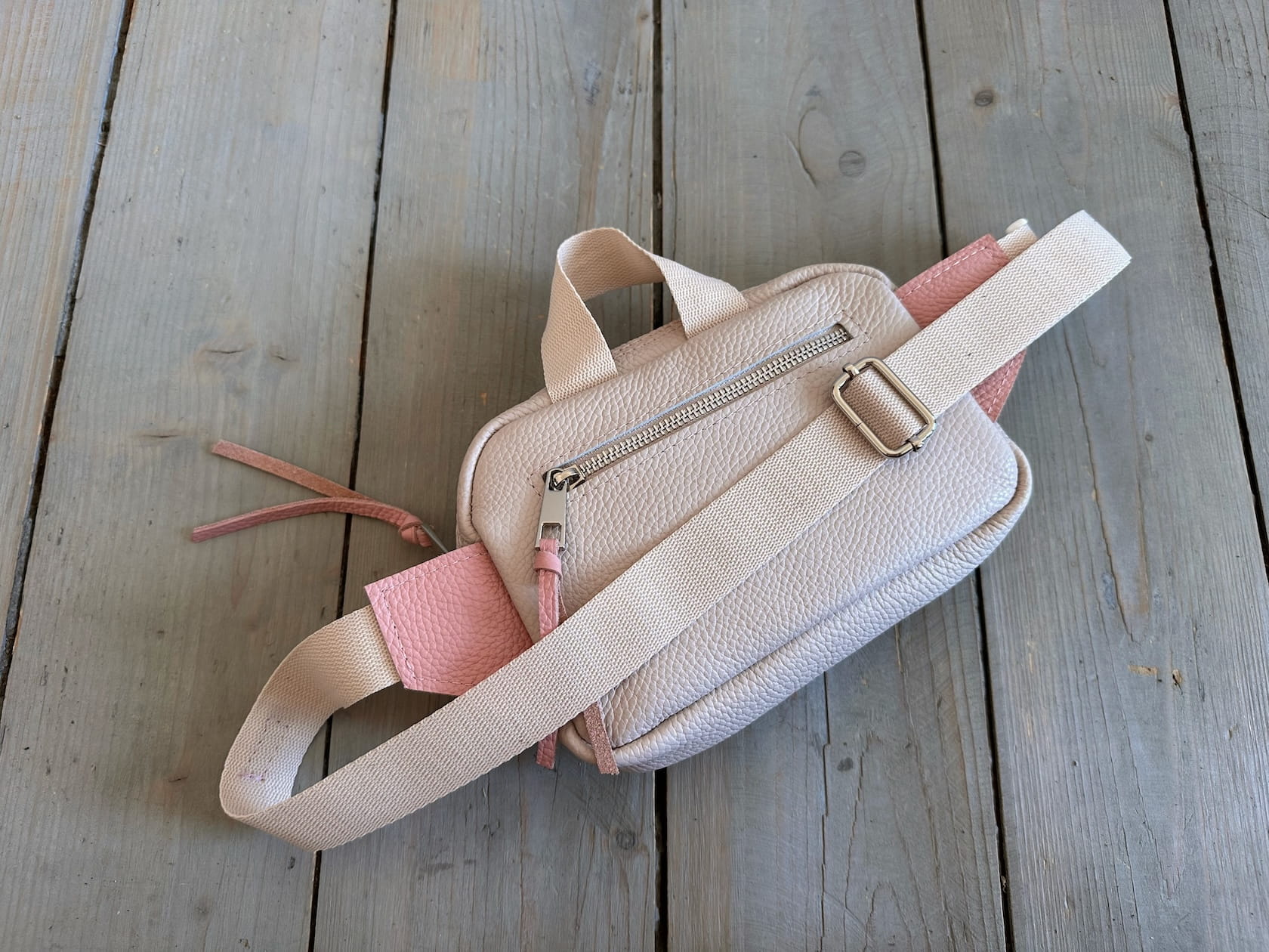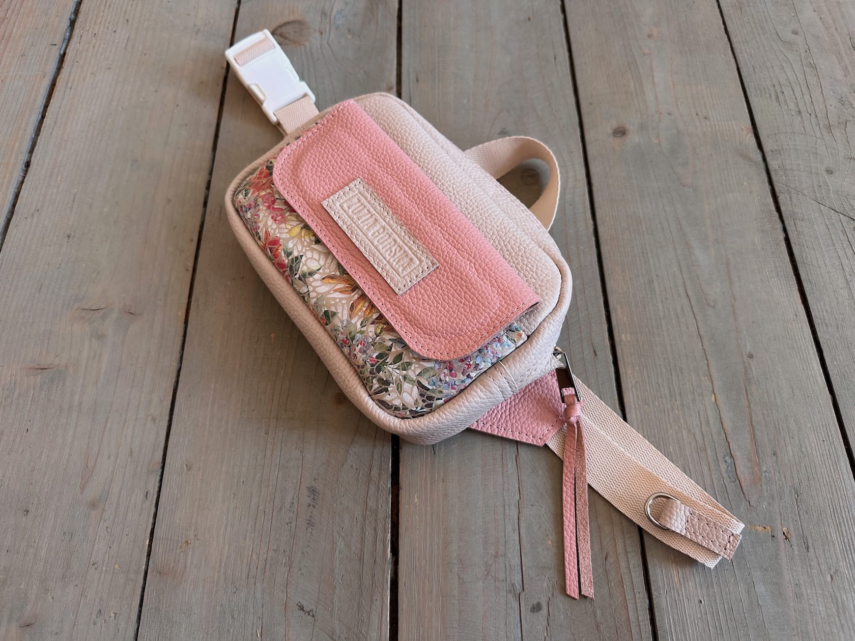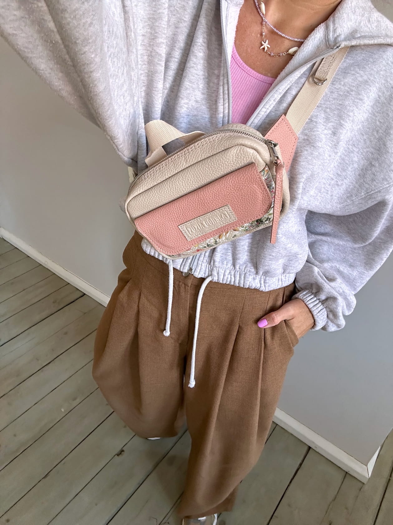 Z tyłu kieszonka na zamek, z przodu kiszona pod klapką, wewnątrz przegródka + smyczka z karabińczykiem.