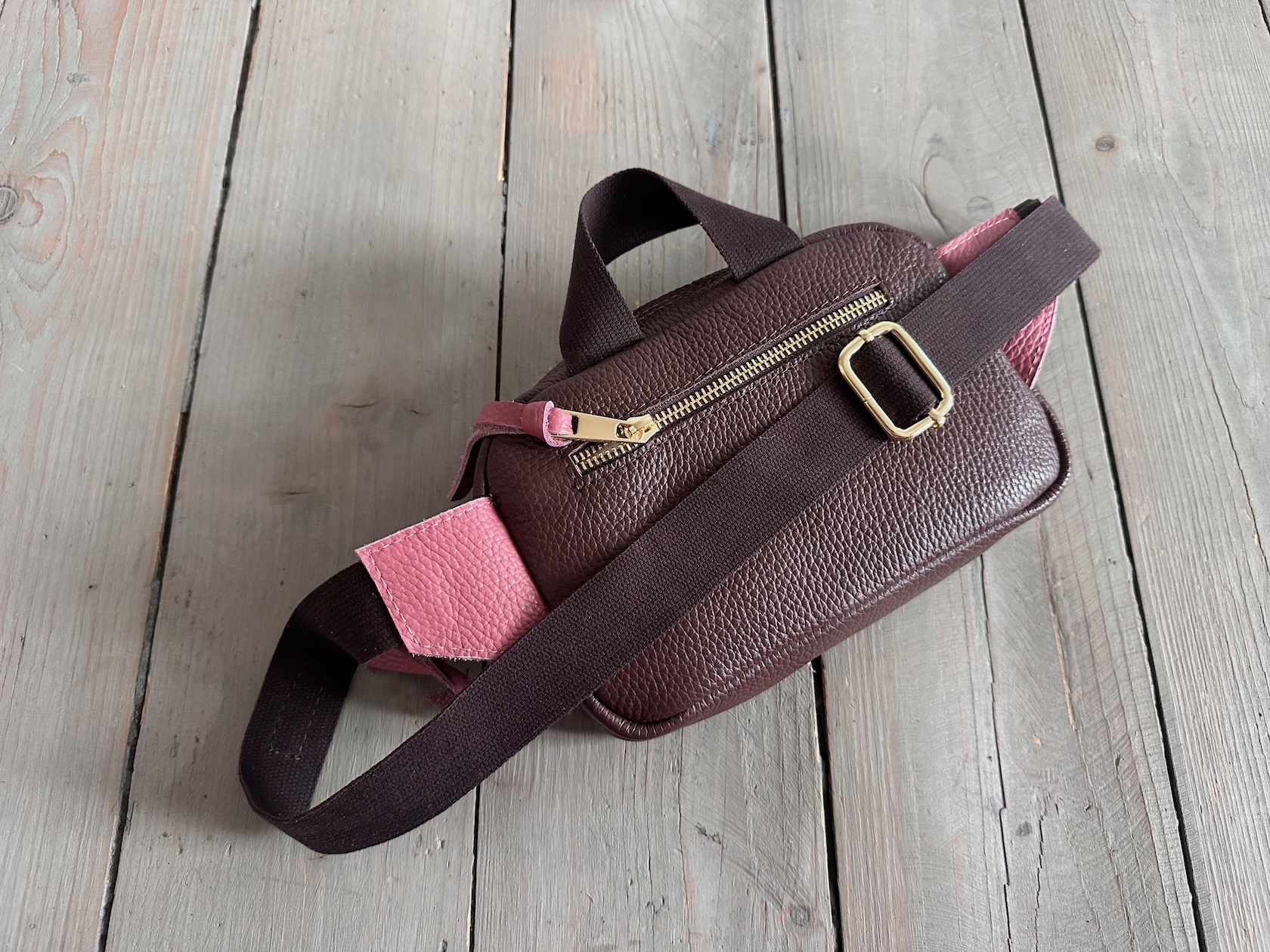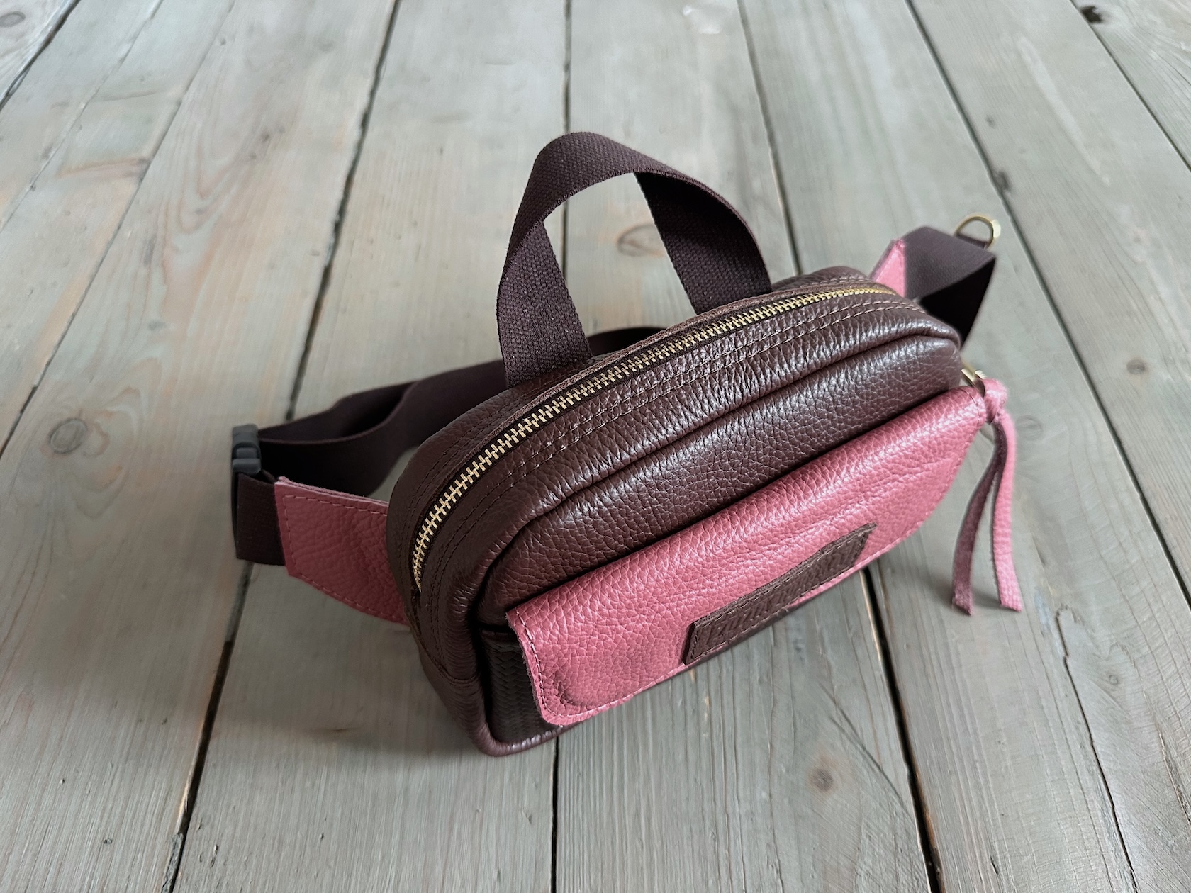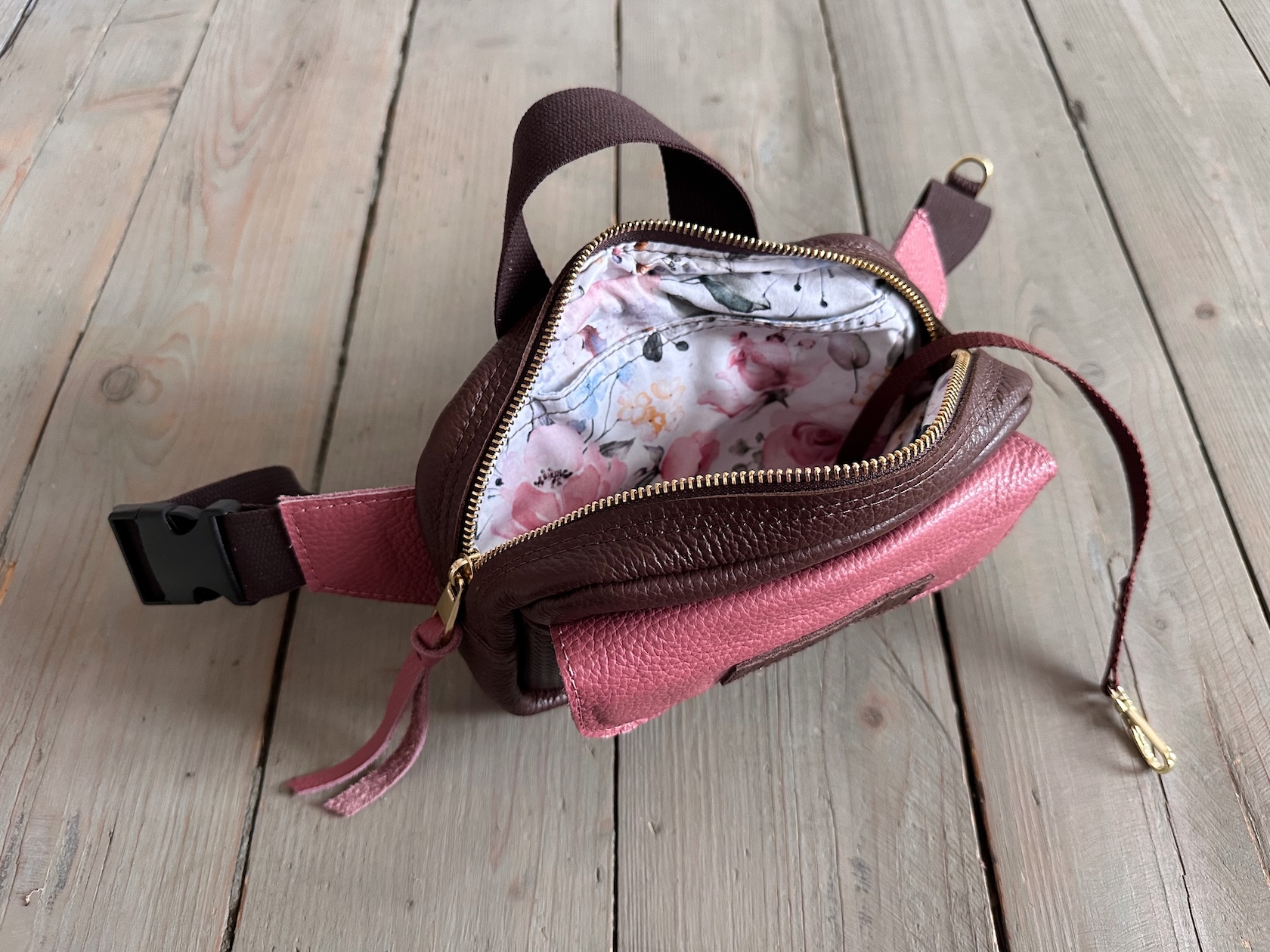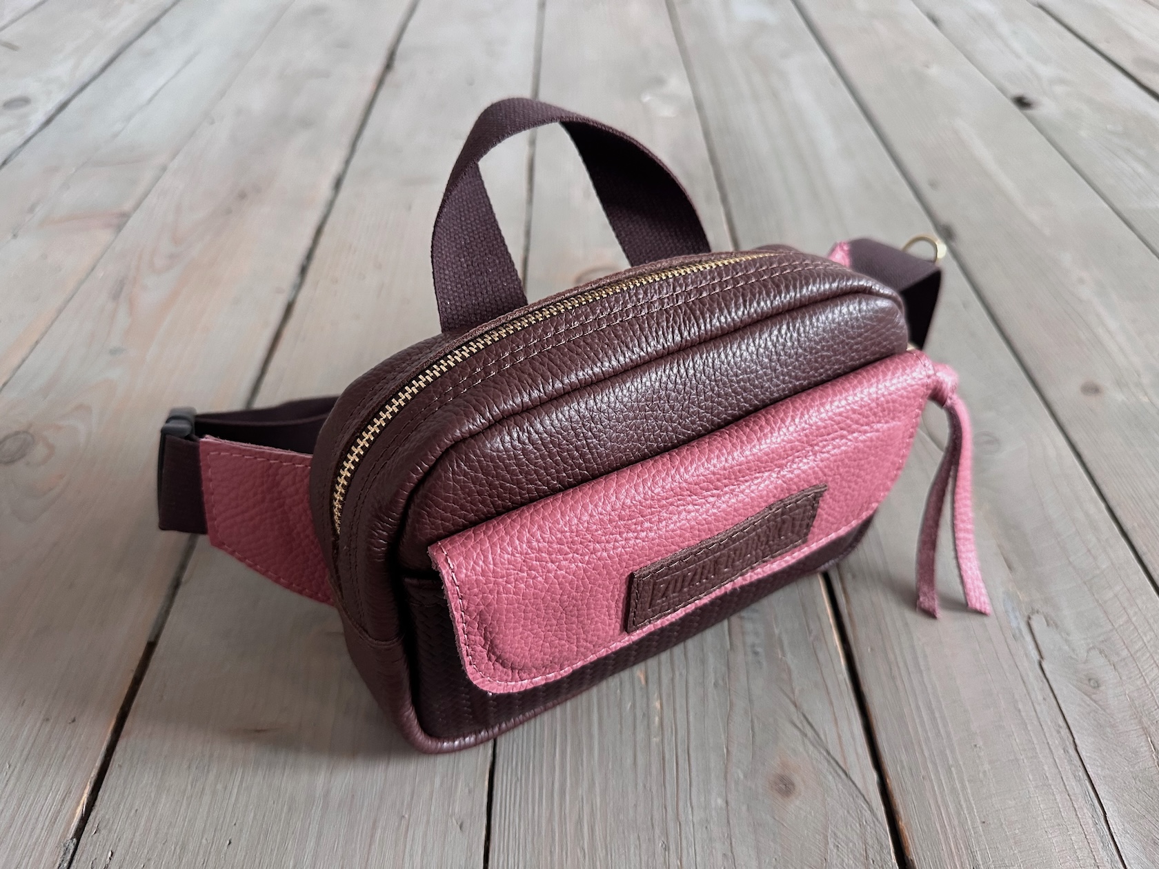 Z tyłu kieszonka na zamek, z przodu kieszonka pod klapką, wewnątrz przegródka + smyczka z karabińczykiem.